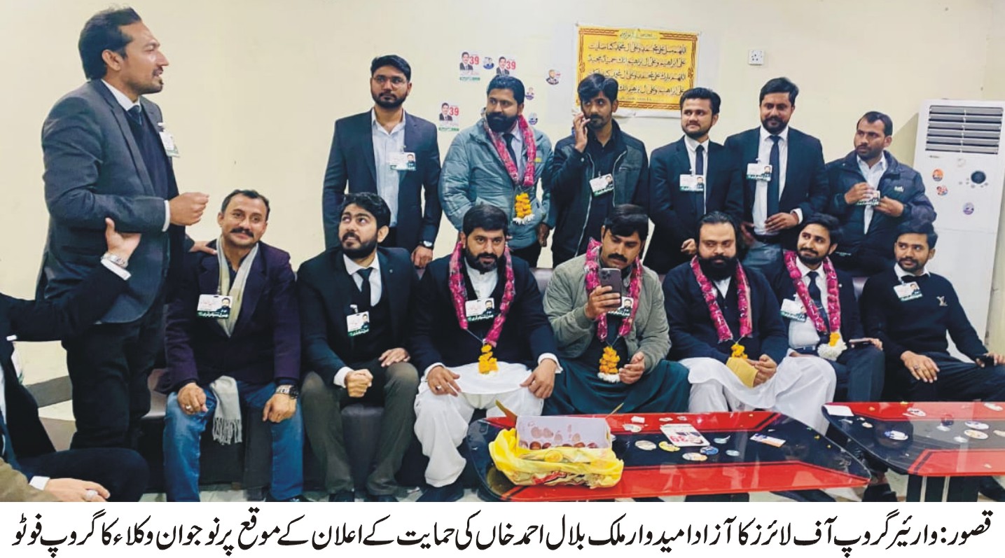 قصور(سید خرم شاہ سے) وارئیر گروپ آف لائرز نے قصور بار ایسوسی ایشن کے جنرل سیکرٹری کے عہدے کے لیے آزاد امیدوار ملک بلال احمد خاں کی باقاعدہ حمایت اور اناؤنسمنٹ کر دی۔ اس موقع زاہد بیگ ایڈووکیٹ، ثاقب غفور ایڈووکیٹ،چوہدری سلیم ایڈووکیٹ،ملک شعبان ایڈووکیٹ، راشد ایڈووکیٹ، ملک رشید نول ایڈووکیٹ، مبین ایڈووکیٹ، عاصم سرفراز ایڈووکیٹ، شہباز ایڈووکیٹ، طارق ضیاد ایڈووکیٹ، عمیر احمد بھٹہ ایڈووکیٹ نے آزاد امیدوار کو اناؤنس کیا اور منعقدہ اجلاس سے خطاب کرتے ہوئے مقررین نے کہا کہ آنے والا وقت نوجوان وکلاء کا ہے اور ینگ وکلاء کو مزید نظر انداز نہیں کیا جا سکتا۔مقررین نے کہا کہ وکلاء کا ووٹ ہر سال استعمال ہو جاتا ہے جبکہ فیصلے چند مخصوص گروپس کرتے ہیں۔ اب وقت آ گیا ہے کہ وکلاء خود اپنے حق کا فیصلہ کریں کیونکہ ووٹ وکلاء کا ہے مگر حق کوئی اور لے جاتا ہے۔آزاد امیدوار ملک بلال احمد خاں نے خطاب کرتے ہوئے کہاکہ اکیلا ہی چلا تھا جانبِ منزل، لوگ ملتے گئے، کارواں بنتا گیا۔”انہوں نے کہا کہ قصور بار میں صرف دو گروپس ہی نہیں بلکہ آزاد امیدوار بھی موجود ہیں جو وکلاء کی حقیقی نمائندگی کرنا چاہتے ہیں۔ملک بلال احمد خاں نے اس عزم کا اظہار کیا کہ منتخب ہو کر قصور بار کی فلاح و بہبود، نوجوان وکلاء کے حقوق کے تحفظ اور بار میں شفاف نظام کے قیام کے لیے بھرپور جدوجہد کریں گے۔ مقررین نے مزید کہا کہ بار میں ریپیٹرز کے تسلط کا خاتمہ اور حقیقی تبدیلی ناگزیر ہو چکی ہے۔