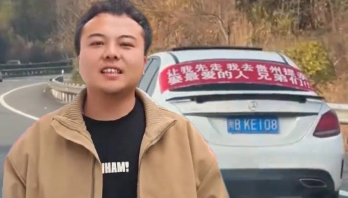 فروری میں یہ شخص چین بھر کے سفر پر نکلا اور گاڑی میں ایک سرخ رنگ کا بینر لگایا ہوا تھا جس میں دیگر گاڑیوں کے ڈرائیورز کا راستہ دینے کے بارے میں لکھا تھا۔ بینر میں لکھا تھا کہ ‘لوگوں مجھے پہلے جانے دو، میں Guizhou جا رہا ہوں تاکہ اپنی محبت کو شادی کی پیشکش کرسکوں’۔