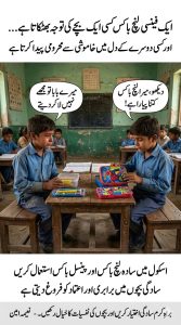 دوسری طرف، جو بچے فینسی اشیاء لے کر آتے ہیں، ان کی توجہ بھی اکثر اپنی چیزوں پر مرکوز رہتی ہے۔ وہ پڑھائی کے بجائے اپنے سامان کو سنبھالنے، دکھانے یا دوسروں سے موازنہ کرنے میں زیادہ دلچسپی لیتے ہیں، جس سے سیکھنے کا عمل متاثر ہوتا ہے۔
